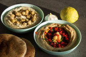 Zdjęcie "Talerz świeżego hummusu domowej roboty z chlebem pita na stole. Autentyczne jedzenie Bliskiego Wschodu. Idea zdrowego odżywiania. Wegańskie zrównoważone danie. Tradycyjny posiłek Izraela. " może być wykorzystywane do celów osobistych i komercyjnych zgodnie z warunkami zakupionej licencji Royalty-free. Obraz jest dostępny do pobrania w jakości wysokiej rozdzielczości do 5760x3840.