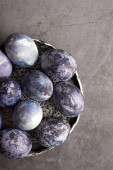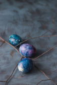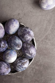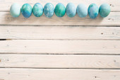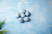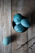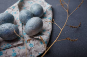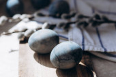 kolorowe marmurowe jaja leżą w filiżance, obok gałęzi wierzby, jako symbol Wielkanocy, na drewnianym stole. rustykalny