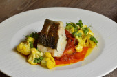 Zdjęcie "Stek halibuta w chrupiącym chlebie z bliska. Obsługiwana kuchnia. Naczynie z filetem rybnym i spaghetti cukinią w sosie pomidorowym w białym talerzu izolowane. Restauracja porcja żywności, pyszna kolacja, danie główne" może być wykorzystywane do celów osobistych i komercyjnych zgodnie z warunkami zakupionej licencji Royalty-free. Obraz jest dostępny do pobrania w jakości wysokiej rozdzielczości do 5760x3840.