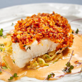 Stek halibuta w chrupiącym chlebie z bliska. Obsługiwana kuchnia. Naczynie z filetem rybnym i spaghetti cukinią w sosie pomidorowym w białym talerzu izolowane. Restauracja porcja żywności, pyszna kolacja, danie główne