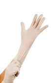 Kobieta zakłada białe gumowe rękawiczki. Odizolowane na biało.