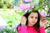 Zdjęcie "Portret hipsterki stojącej w wiosennym kwiatowym ogrodzie kwiatów i patrzącej w kamerę. Piękna szczęśliwa młoda kobieta ciesząca się zapachem w kwitnącym powołaniu wiosny." może być wykorzystywane do celów osobistych i komercyjnych zgodnie z warunkami zakupionej licencji Royalty-free. Obraz jest dostępny do pobrania w jakości wysokiej rozdzielczości do 5760x3840.