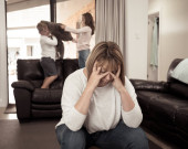 COVID-19 Izolacja i zdrowie psychiczne. Zestresowani rodzice zmagający się z dziećmi w domu podczas zamknięcia Coronavirus. Przytłoczona matka radząca sobie z niespokojnymi dziećmi walczącymi w kwarantannie.