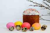 dwa wielobarwne jajka i ciasto wielkanocne leżą na drewnianym stole