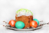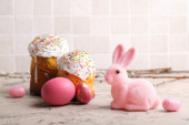 Ciasto wielkanocne, dwa jajka i dekoracyjny kurczak leżą na żółtym drewnianym tle