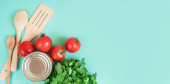 Świeże produkty na jasnym tle. Spaghetti, pomidor, bulgur, gulasz, pieprz, eko-worek. Widok z góry, miejsce na tekst.