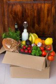 Zero odpadów nie ma plastiku bezpieczne usługi dostawy do domu. Pudełko żywności w opakowaniu nadającym się do recyklingu w pobliżu drzwi klienta. Internetowe zamówienie internetowe, zakupy podczas koronawirusu, blokada, pobyt w domu, izolacja