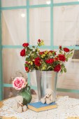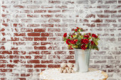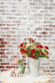 Czerwone kasztanowe róże w metalowym, ocynkowanym garnku. Sztuczne sztuczne kwiaty różane wystrój w wiadrze na tle cegły ściany. Róże w garnkach i dwa małe niedźwiedzie na dekoracji stołu ogrodowego Walentynki