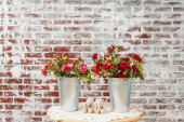 Zdjęcie "Czerwone kasztanowe róże w metalowym, ocynkowanym garnku. Sztuczne sztuczne kwiaty różane wystrój w wiadrze na tle cegły ściany. Róże w garnkach i dwa małe niedźwiedzie na dekoracji stołu ogrodowego Walentynki" może być wykorzystywane do celów osobistych i komercyjnych zgodnie z warunkami zakupionej licencji Royalty-free. Obraz jest dostępny do pobrania w jakości wysokiej rozdzielczości do 5760x3840.