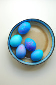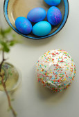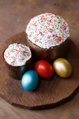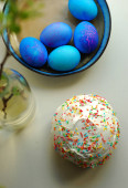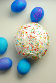 Tradycyjny prawosławny chleb wielkanocny Kulich i niebieskie jajka