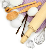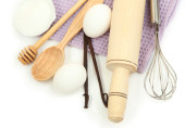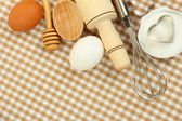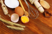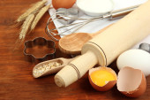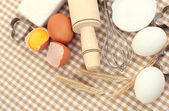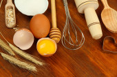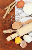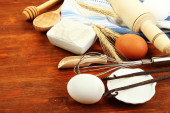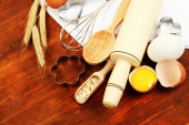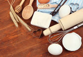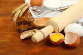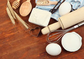 gotowania. podstawowych składników pieczenia i naczynia kuchenne na drewnianym stole
