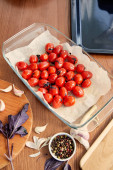 Widok górny tacki piekarnika, talerz i deska do krojenia ze składnikami w pobliżu noża i miski na drewnianym tle