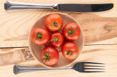 Zdjęcie "Grupa sześciu całych świeżych pomidorów czereśniowych na talerzu na drewnie" może być wykorzystywane do celów osobistych i komercyjnych zgodnie z warunkami zakupionej licencji Royalty-free. Obraz jest dostępny do pobrania w jakości wysokiej rozdzielczości do 5760x3840.