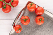Grupa sześciu całych świeżych pomidorów czereśniowych na talerzu na drewnie