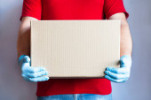 Zdjęcie "Kurier w czerwonym mundurze i rękawiczkach medycznych daje pudełko z jedzeniem kobiecie w rękawiczkach ochronnych w pobliżu drzwi. Bezpieczna dostawa żywności podczas zamykania, zakupów online lub darowizn." może być wykorzystywane do celów osobistych i komercyjnych zgodnie z warunkami zakupionej licencji Royalty-free. Obraz jest dostępny do pobrania w jakości wysokiej rozdzielczości do 5760x3840.