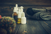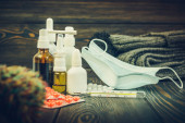 Mydło w płynie i maski medyczne na stole - zapobieganie wirusom