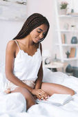 Afroamerykanka czytająca książkę na łóżku w sypialni