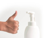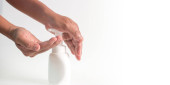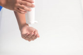 Podczas epidemii koronawirusów matka uczy dzieci mycia rąk żelem alkoholowym wyizolowanym na białym tle..
