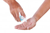 Zdjęcie "Podczas epidemii koronawirusów matka uczy dzieci mycia rąk żelem alkoholowym wyizolowanym na białym tle.." może być wykorzystywane do celów osobistych i komercyjnych zgodnie z warunkami zakupionej licencji Royalty-free. Obraz jest dostępny do pobrania w jakości wysokiej rozdzielczości do 5760x3840.