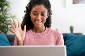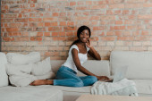 Zdjęcie "Afrykański amerykański freelancer ze skrzyżowanymi nogami i laptopem uśmiecha się i pokazuje znak okay w pobliżu smartfona na kanapie w salonie" może być wykorzystywane do celów osobistych i komercyjnych zgodnie z warunkami zakupionej licencji Royalty-free. Obraz jest dostępny do pobrania w jakości wysokiej rozdzielczości do 5760x3840.