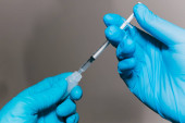 Ampułki z lekiem na szczepionkę przeciw chorobom, grypa w rękach lekarza w rękawiczkach - poszukiwanie szczepionki, leczenie grypy, koronawirusy, covid19