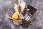 Zero odpadów. Ekologiczne akcesoria łazienkowe i kuchenne na zielonym tle. Płaskie ułożenie, widok z góry, przestrzeń do kopiowania.