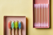 Zdjęcie "Zero odpadów. Drewniane bambusowe szczoteczki do zębów w beżowej metalowej tacy na beżowym tle. Płaskie ułożenie, widok z góry, przestrzeń do kopiowania." może być wykorzystywane do celów osobistych i komercyjnych zgodnie z warunkami zakupionej licencji Royalty-free. Obraz jest dostępny do pobrania w jakości wysokiej rozdzielczości do 5760x3840.