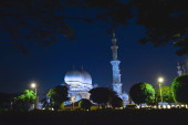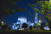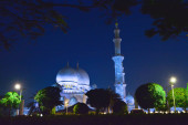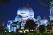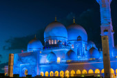 Wspaniały widok na Wielki Meczet Szejka Zayeda w Abu Zabi przed wschodem słońca. Największy meczet w kraju, jest kluczowym miejscem kultu codziennej modlitwy.