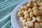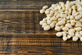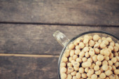 Groszek w metalowej łyżeczce z bliska na brązowym tle