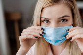 piękna młoda kobieta w masce medycznej i termometrze