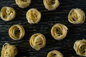 Zdjęcie trzech kawałków tradycyjnego włoskiego surowego makaronu niegotowanego Tagliatelle na czarnym pogniecionym papierowym tle, selektywna ostrość. Wegetariańskie jedzenie. Koncepcja żywienia. Włoska kuchnia. Przygotowanie