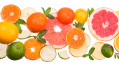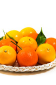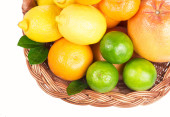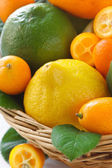 świeżych owoców cytrusowych z liści w wiklinowym koszu