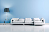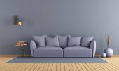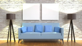 Wnętrze salonu. 3d renderowania sofa stół lampa tło drewno podłoga drewniany niebieski ściana szablon projekt tekstury