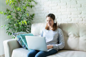 Biała kobieta po czterdziestce siedzi na kanapie i pracuje w domu w laptopie