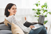 Piękna brunetka po czterdziestce robi coś z domu, siedzi na kanapie i pije kawę.