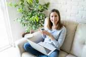 Zdjęcie "Pretty Caucasian brunetka noszenie słuchawek podczas rozmowy wideo do pracy z jej salonu w domu" może być wykorzystywane do celów osobistych i komercyjnych zgodnie z warunkami zakupionej licencji Royalty-free. Obraz jest dostępny do pobrania w jakości wysokiej rozdzielczości do 5760x3840.