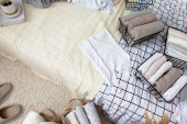 Niezidentyfikowana młoda kobieta w niebieskiej koszuli w paski i dżinsach schludnie wkłada rzeczy do metalowych pojemników w przytulnej sypialni. Pojęcie porządku i porządku.
