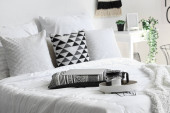 Zdjęcie "Metalowe pojemniki siatkowe pełne ubrań i pościeli stoją na łóżku i na podłodze w sypialni z filiżanką kawy podczas ogólnego sprzątania. Koncepcja aktualizacji i organizacji" może być wykorzystywane do celów osobistych i komercyjnych zgodnie z warunkami zakupionej licencji Royalty-free. Obraz jest dostępny do pobrania w jakości wysokiej rozdzielczości do 5760x3840.