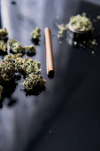 Pąki konopi w ręku na czarnym tle Tło dla miejsca Kopiuj. CBD i THC na pączkach konopi indyjskich. Blunt i Zapalniczki. Młynek do ziół Świeża marihuana. Zamknij się..