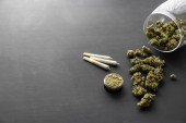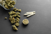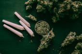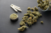 staw z ziołem, zbliżenie, Pąki konopi na czarnym stole, szlifierka ze świeżą marihuaną,