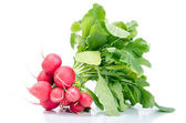 Dojrzała czerwona rzodkiewka z liśćmi na białym tle