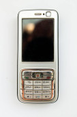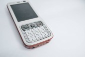 stary telefon z przyciskiem na białym tle