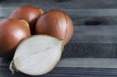 biała cebula na niebieskim tle połowa białej cebuli z bliska pod tekstem