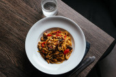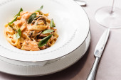 pyszne makarony z pomidorami serwowane z sztućcami, solą i pieprzem młyny na białym stole w słońcu