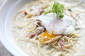 pyszny makaron carbonara podawany z żółtą serwetką na drewnianym stole w świetle słonecznym