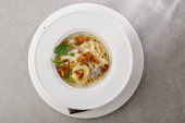 pyszne makaron carbonara serwowane ze sztućcami na czarnym stole na marmurowym tle w słońcu