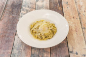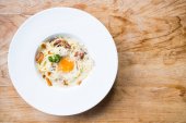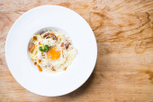 widok z góry pyszne makaron carbonara serwowane z czarnymi sztućcami na drewnianym tle w słońcu