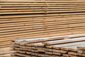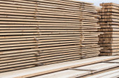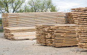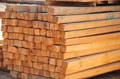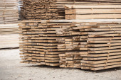 Drewniane belki sosnowe na stosie na zewnątrz. Materiały budowlane