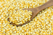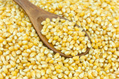 Orzeszki sosnowe. Niełuskane ziarna. Orzechy leżą w drewnianej łyżce.