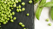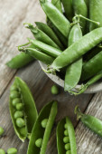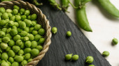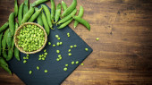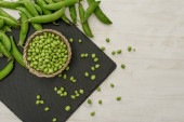 Makro zamknąć niski kąt widok świeżego grochu łuskanego w wiklinowym koszu na czarnej płycie łupkowej i kilka strąków na jasnym drewnianym tle. Czarny, biały i zielony kontrast od zdrowej kuchni wegańskiej